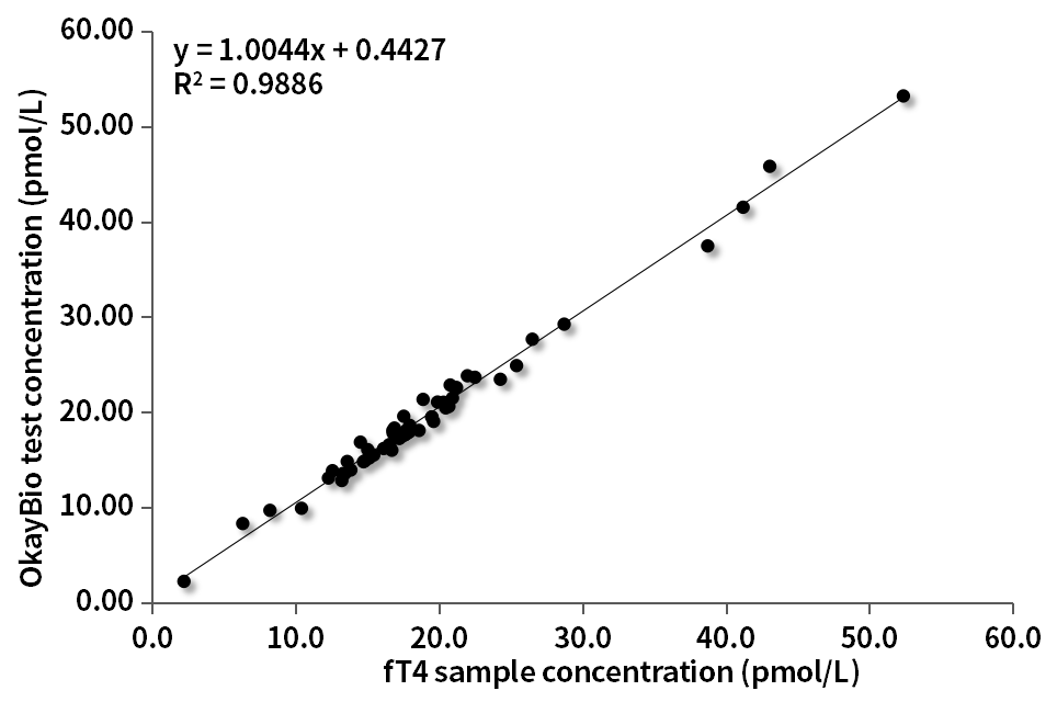 用T4夾心抗體(R555a5、R534a7)檢測59例fT4羅氏賦值樣本(濃度范圍2.2~52.4pmol/L)和48例tT4羅氏賦值樣本(濃度范圍15~208nmol/L),相關(guān)性(R2)分別為0.9886、0.9666。