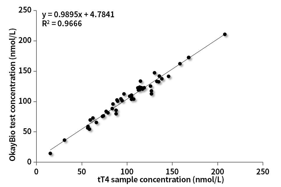 用T4夾心抗體(R533c3、R555a5)檢測26例fT4羅氏賦值樣本(濃度范圍0.9~84.28pmol/L)和24例tT4羅氏賦值樣本(濃度范圍10.3~208nmol/L),相關(guān)性(R2)分別為0.9489、0.9498。